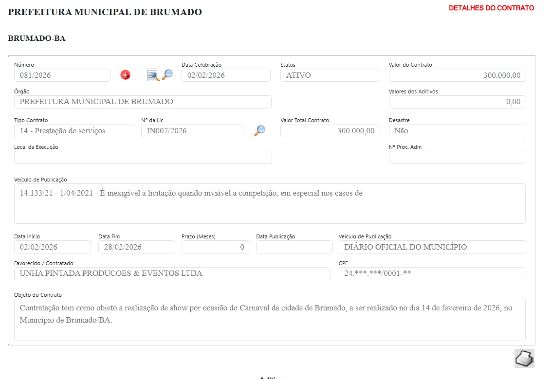 O contrato nº 081/2026 foi formalizado pela Prefeitura Municipal de Brumado para a realização de um show no dia 14 de fevereiro de 2026, dentro da programação carnavalesca.