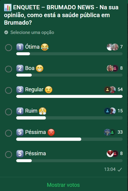 Uma enquete promovida pelo Brumado News, realizada nos últimos dias em um grupo com mais de mil membros de diferentes posicionamentos partidários, ouviu 125 participantes sobre a situação da saúde pública em Brumado. O levantamento mostrou predominância de avaliações entre regular e negativas, revelando um cenário de atenção para a gestão municipal e para a própria população.